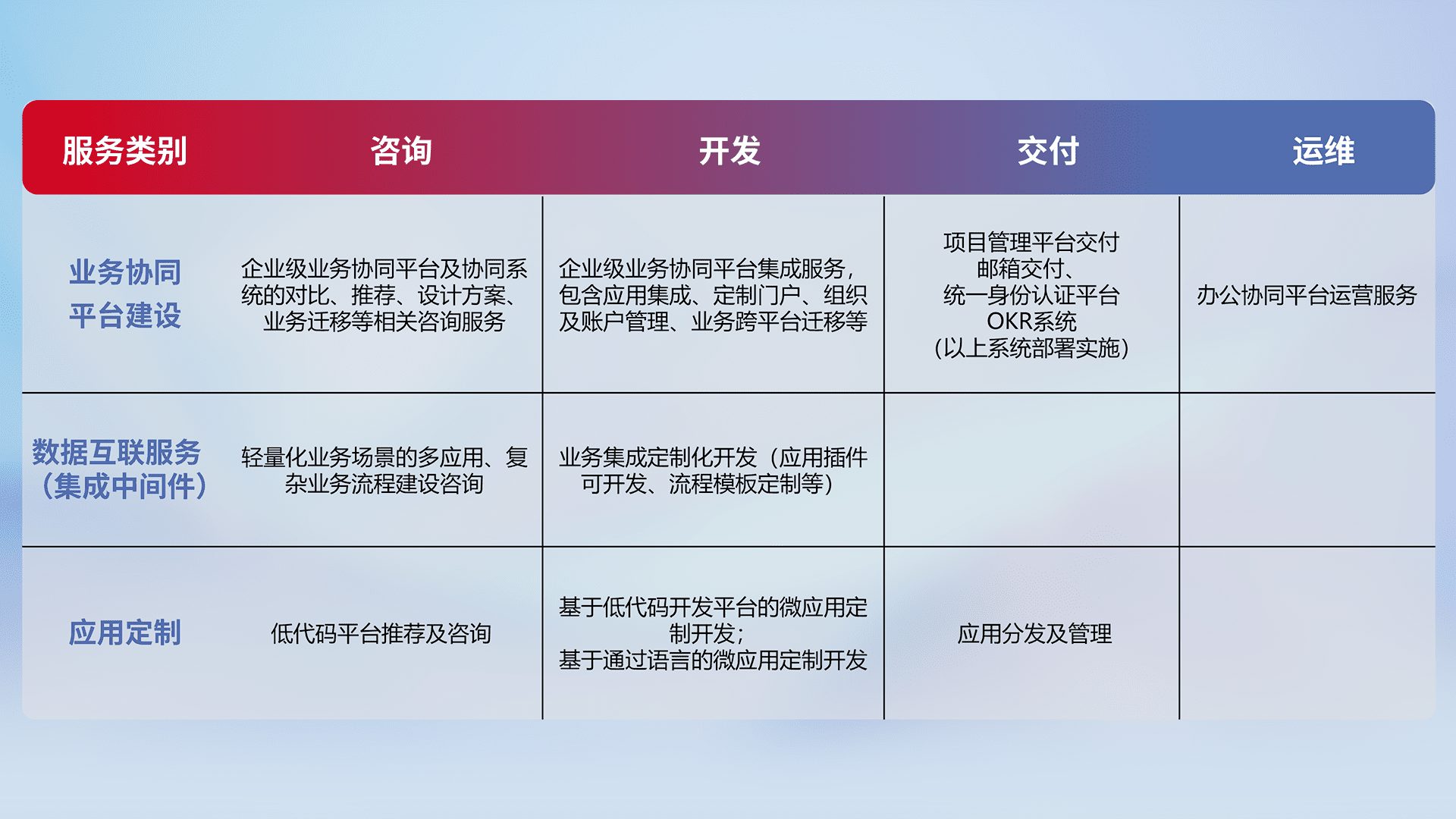 针对钉钉、、、企微、、、IDaas等平台级产品提供产品的规划、、、方案、、、交付、、、、定制化开发等服务,,,实现如统一协同办公、、、、智能客户服务、、、混合会议管理、、智能数据查询、、、等业务场景,,实现数字化转型。。。